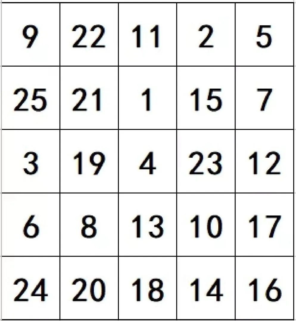 在一张方形卡片上,画上25个小方格,每个方格里随机写上1 - 25的数字,让孩子按顺序快速指出数字,记录所用的时间。
